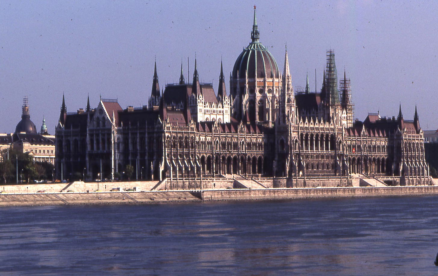 The Hungarian parliament buildings on the Buda side of the Danube, taken from the Pest side. This was our first bike touring trip in Europe, ten weeks that took us to France, Italy, (former) Yugoslavia, Hungary and Austria. (1986)