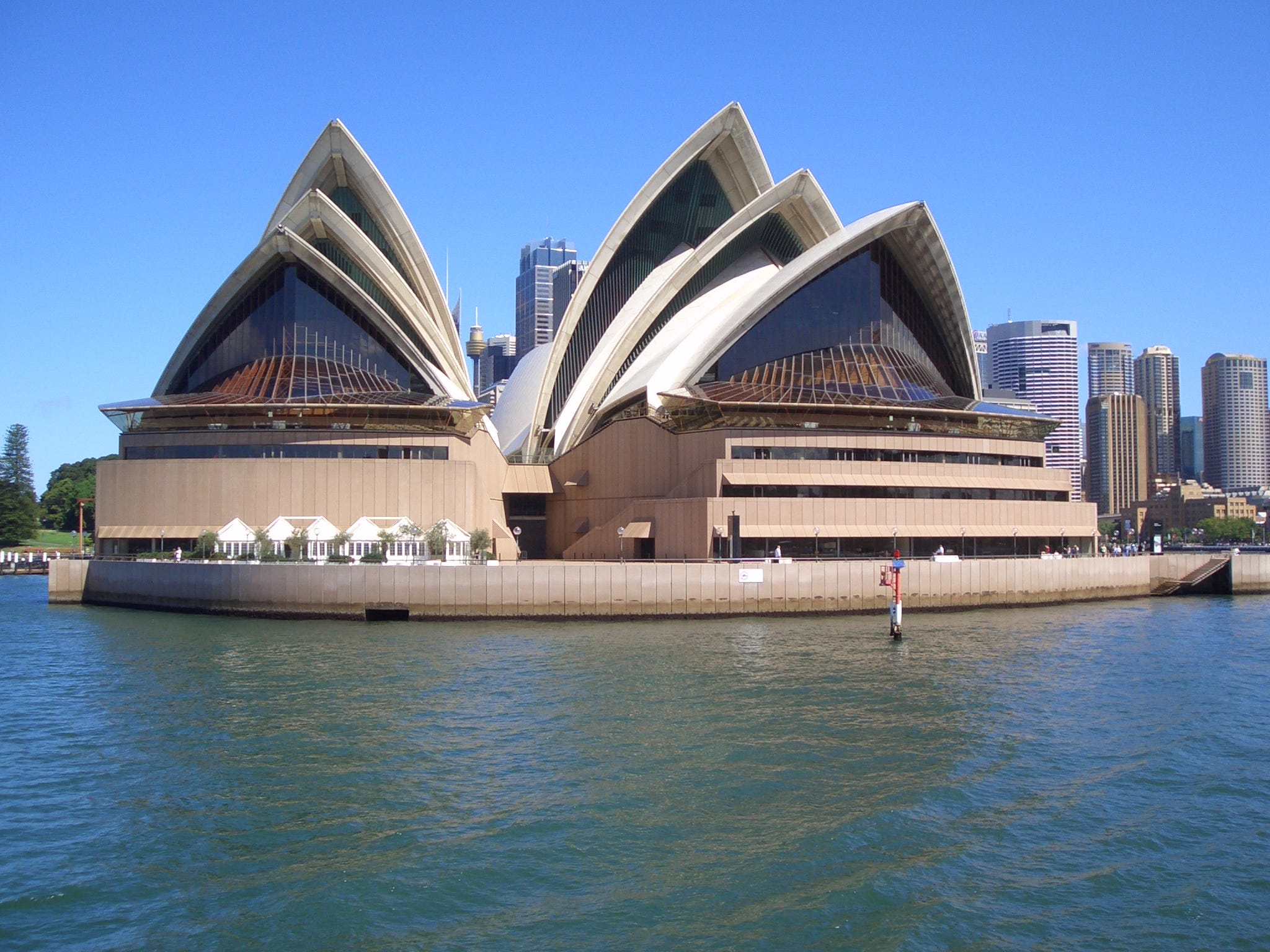 The Sidney Harbor Opera House took 14 tumultuous years to construct, due to the near-impossibility of casting the many precast concrete “shells.” (2005)